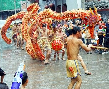 如今已發(fā)展成為對喜慶節(jié)日的慶祝,對美好生活祝福的一種方式。它用鮮棕葉作龍須,用葛藤、黃荊條、松樹枝作龍身,分9節(jié)、11節(jié)、1 3節(jié)、15節(jié)等不同長度的奇數(shù),由9至15人參加舞龍。伴著鑼、鼓、鎖吶的鏗鏘樂曲,一人持“寶”在前,龍舞歡騰時有“二龍搶寶”、“蛇蛻皮”、“烏龍絞柱”等50多種動作玩法。與此同時,身著民族服裝的群眾用臉盆、水瓢、銻桶等容器端水圍繞著龍潑澆,這樣邊舞邊潑水、水潑得越多龍舞得越歡,也預祝大家當年風調(diào)雨順,五谷豐登,其場面歡樂喜慶,風趣幽默。已列入我市第一批非物質文化遺產(chǎn)保護名錄。