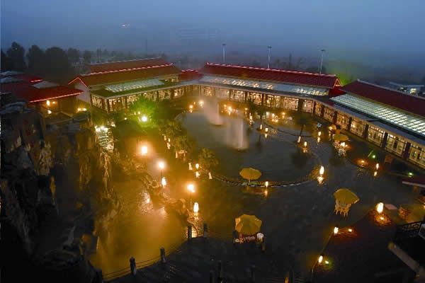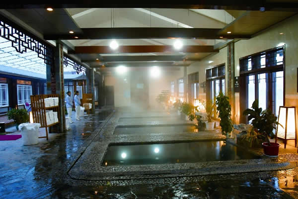 江埡溫泉主要硬件特色是高標準的自然園林式露天溫泉與室內(nèi)溫泉,建有同心池、六福湯、瀑布溫泉、石板溫泉、椰奶溫泉、花草溫泉、咖啡溫泉、紅酒溫泉等,布局體現(xiàn)出鄉(xiāng)土格調(diào),鵝卵石、青石板鋪地, 假山瀑布,小橋流水,20余種各賦特色、各具功能的溫泉池鑲嵌其中, 一派恬淡寧靜的詩情畫意。