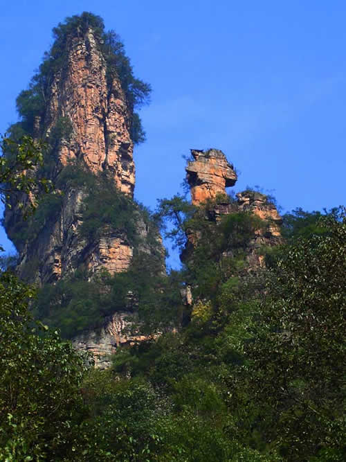 過南天門繼續(xù)登山約200注,有一岔道口,叫月亮埡, 往右便是天子山石家檐景區(qū),向右斜上則通天臺。天臺海拔1020米,有東西兩個觀景臺。東臺為一懸空巨石,四周雜樹叢生,古松倒掛,是觀日出的理想之所。西臺俯視西海最妙,但見幽深莫測的峽谷中,千峰聳立,戴翠披綠,秀麗的景色盡收眼底。