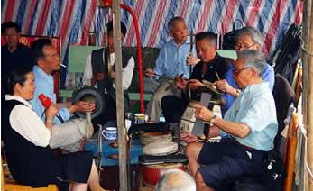 圍鼓(含嗩吶)。又稱打鎦子、打排鼓,是民間紅白會(huì)中不可缺少的樂器。一般7人演奏,樂器有一鼓、一大鑼、一公鑼、兩副鈸、兩嗩吶。其詞曲紅白會(huì)通用,以鼓和嗩吶上系紅、白布為分別標(biāo)記(結(jié)婚不打“四字鈸”曲)。史傳的圍鼓詞有《撩子》、《火鋪》等,《撩子》分《一二三》、《閃翅》、《堆羅漢》、《反落花》等十章,《火鋪》也分《三槍》、《四進(jìn)門》、《八哥洗澡》、《蓮魚吐絲》等十章,嗩吶詞有《八十正宮》調(diào)等。在農(nóng)村,圍鼓是最普及的樂器,每逢紅白喜事都有圍鼓和嗩吶表演。