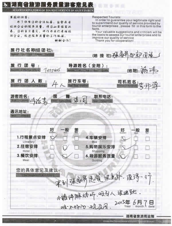 5月下旬,上海張女士一行四位貴賓與湖南西部(張家界)中國(guó)國(guó)際旅行社工作人員——龔玲取得聯(lián)系,經(jīng)過(guò)商談,雙方達(dá)成協(xié)議并簽訂旅游合同,于6月4日抵達(dá)張家界,開(kāi)始張家界之旅。此次行程是由我社優(yōu)秀導(dǎo)游——褚偉,負(fù)責(zé)旅游接待工作,褚導(dǎo)在旅游過(guò)程中講解詳細(xì),客人也很滿(mǎn)意,在意見(jiàn)表上寫(xiě)到:來(lái)到張家界感覺(jué)很意外,值得一行,小褚講解動(dòng)聽(tīng),吸引人,很幽默!同時(shí)也感謝張女士選擇湖南西部(張家界)中國(guó)國(guó)際旅行社,以及您對(duì)湖南西部國(guó)旅的信任與支持。我們會(huì)繼續(xù)努力,做好旅游接待工作。期待下一次與您的合作,祝您愉快!
