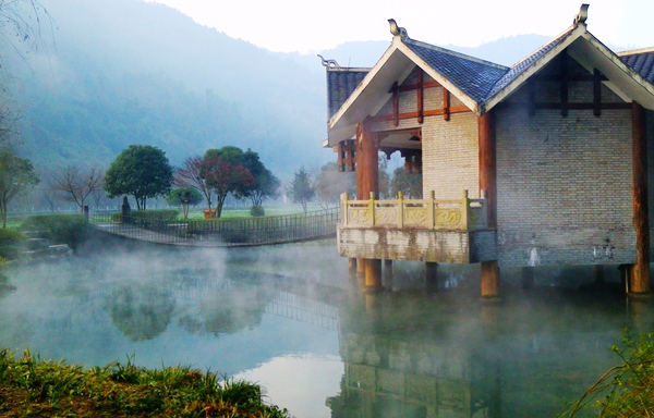 “泉源沸涌,浩氣云浮!睋(jù)了解,黃龍洞生態(tài)廣場的水源出自于洞內(nèi)的地下河,水溫常年保持在16攝氏度左右。當(dāng)從洞內(nèi)流淌出來的溫暖水流與洞外的低溫空氣相遇之后,頓時形成沸騰的水汽,從而形成“浩氣”景觀。
