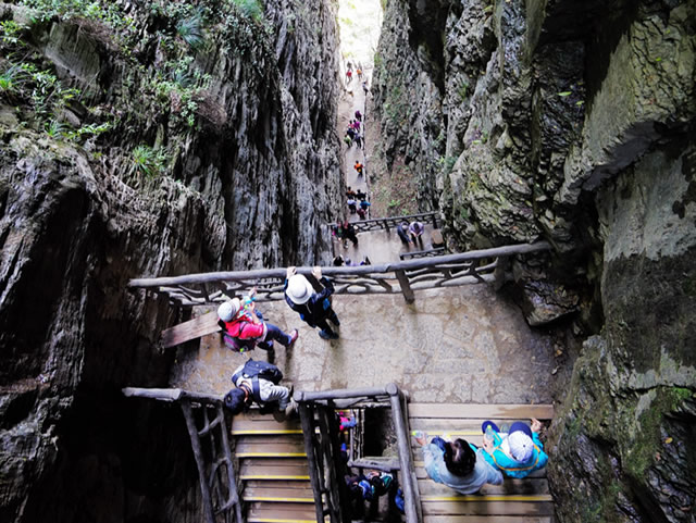 天梯棧道的木板很窄,依次往下延伸,就像一架天梯,把我們送往迷人的仙境。這道“天梯”不是天賜的,而是靠了當(dāng)?shù)氐纳矫,腰系繩索,手扶峭壁,肩扛背馱,將這些堅(jiān)硬而沉重的石頭從山頂一塊一塊地運(yùn)來、鋪好,鋪成現(xiàn)在這條看似險(xiǎn)峻、其實(shí)結(jié)實(shí)安全的1600多級(jí)石階棧道。