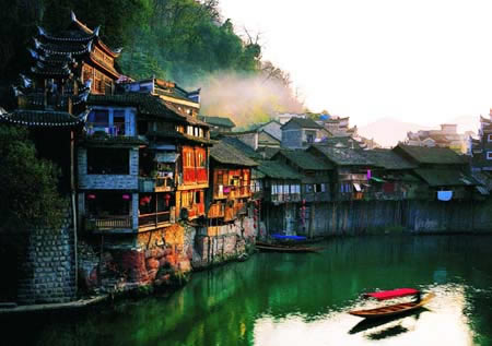 【鳳凰古城位于沱江之畔、群山環(huán)抱、關(guān)隘雄奇、碧綠的沱江依著城墻緩緩流淌,疊翠的南華山麓倒映江中,江中漁舟游船數(shù)點,山間暮鼓晨鐘兼鳴,懸崖上的吊腳樓輕煙裊裊,碼頭邊的浣紗姑笑聲朗朗,兩岸已有數(shù)百年歷史的吊腳樓更是別有一番風(fēng)味;順水而下穿過虹橋一幅江南水鄉(xiāng)的畫面便展現(xiàn)于眼前--萬壽宮、萬名塔、奪翠樓……一種遠離塵世的感覺悠然而生;鳳凰--猶如“一幅濃墨淺彩的中國山水畫”】(游覽時間約3小時左右)